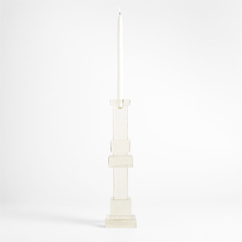 The unexpected combination of geometric shapes and organic texture give our Lumen candlestick fascinating character. Skilled artisans press glass by hand into a stacked silhouette with ethereal beauty. Pairing beautifully with the other cast glass pieces in our Jeremiah Brent collection, the taper holder instantly adds collected-over-time depth to your candlelight collection.