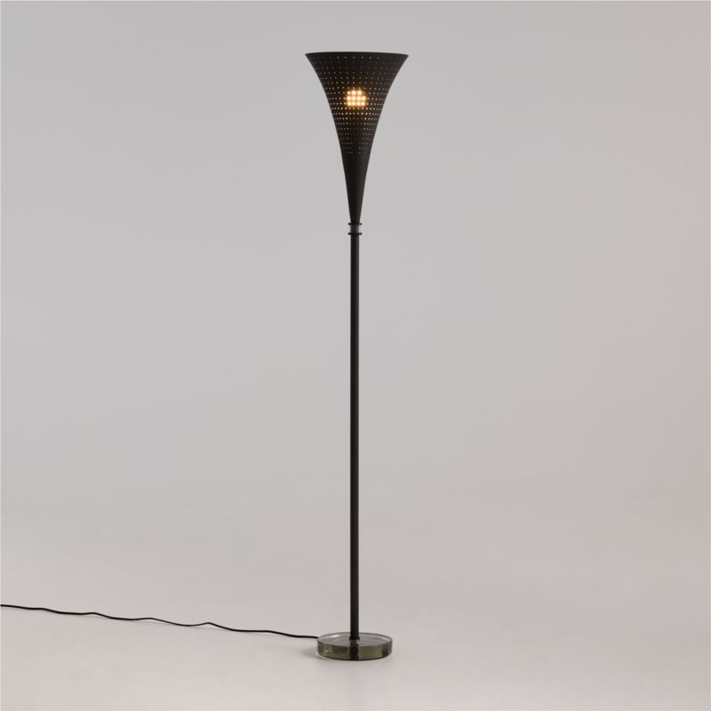 Luna reimagines the allure of Art Deco torchieres with a modern mix of materials. Rising seamlessly from a slender stem, the flared dark pewter-finished iron shade is perforated throughout to cast intricate patterns of light. A thick round of cast glass anchors the lamp with hammered-like texture, echoed in a glass ring on the stem. This floor lamp has an elegant and individual presence placed next to an armchair or sofa.