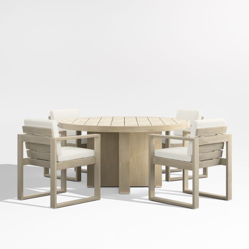 Settle into the enduring coastal style of Mallorca. Designed to last season after season, the dining table and chair set showcases the long-lasting durability and natural beauty of eucalyptus wood, which has been painted and wirebrushed to resemble naturally weathered driftwood. The round dining table features a round slatted top on a sculptural X base, pairing perfectly with the modern lines and bold geometry of the dining chairs. Soft-yet-supportive cushions are covered in outdoor-friendly ivory fabric or your choice of colors in performance Sunbrella fabric.