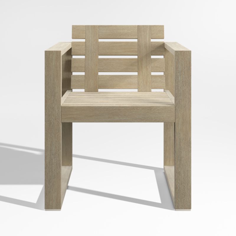 Planks of durable, sustainably sourced eucalyptus wood shape Mallorca's bold geometry, while a painted and wire-brushed finish emulates the look of weathered driftwood. The slatted back and set of this outdoor dining chair are supported by minimalist sleigh legs that continue into armrests. To create the ideal spot for lingering over alfresco meals or soaking up the sun in style, complete the dining arm chair with the soft-yet-supportive Mallorca outdoor cushion (sold separately).