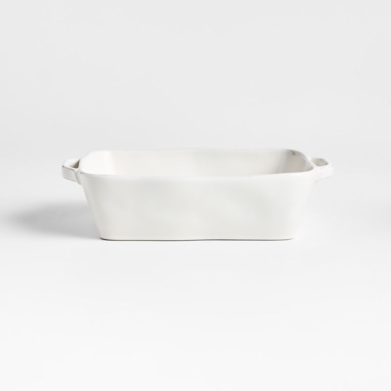 Subtle hand-antiquing on the freeform rim finishes our artisanal ceramic baker glazed in soft white. The unique form suits organic modern tables and is plenty chic for elegant occasions. Made of durable stoneware, the baker is sturdy enough for use every day. Rustic handles carry the small baking dish easily from the oven to the table, where it beautifully presents baked side dishes and smaller desserts. Our dishwasher-safe rectangular baker cleans up easily after dinner parties and family meals. For a coordinated dining aesthetic, set a table with our Marin dinnerware and other serving pieces, all Crate and Barrel exclusives. Due to its handcrafted nature, each small baker will be unique.