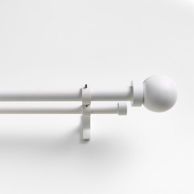 Our two-tier curtain rod set hangs both panels and sheers for a layered look, adjusting easily to your preferred levels of light and privacy. Simple yet statement-making matte white spheres punctuate your drapery with clean geometry, adding definition to the slim curtain rods and understated brackets. Complete your window dressing with our coordinating white curtain rings and tiebacks (sold separately).