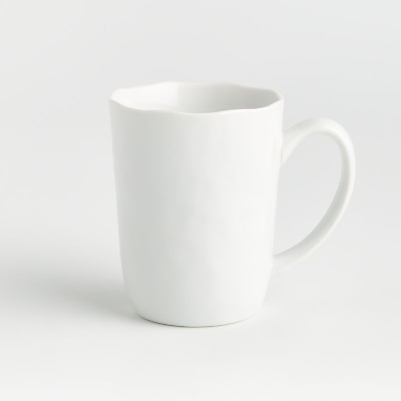 Contemporary porcelain whiteware represents a fusion of refinement and rusticity. The round slim profile of this mug takes on organic overtones with freeform rims and a finely "hammered" surface that ripples the light. Smooth enough to not harm tables, the unglazed ceramic bottom surface gives each piece an artisanal look.