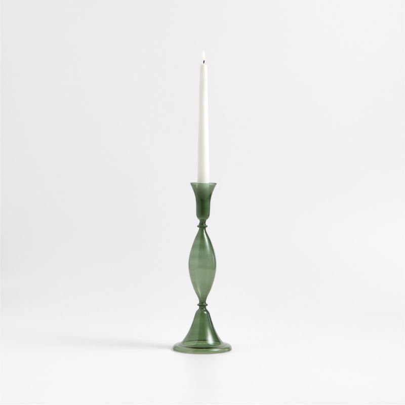 Milano reimagines vintage candlesticks, updating the ornate silhouettes with streamlined curves in green glass to stunning effect. Hand-blown by skilled craftspeople, this large, intricately curved candle holder culminates in an elongated cup that supports a taper or doubles as a bud vase. The modern green tint glows warmly in candlelight. Display the subtly playful piece solo for a sculptural look, or layer with other exclusive Milano glass taper holders in various heights and hues for a more eclectic, extravagant effect.