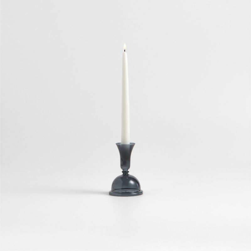 Milano reimagines vintage candlesticks, updating the ornate silhouettes with streamlined curves in indigo glass to stunning effect. Hand-blown by skilled craftspeople, this small, intricately curved candle holder culminates in an elongated cup that supports a taper or doubles as a bud vase. The modern grey-blue tint glows moodily in candlelight. Display the subtly playful piece solo for a sculptural look, or layer with other exclusive Milano glass taper holders in various heights and hues for a more eclectic, extravagant effect.