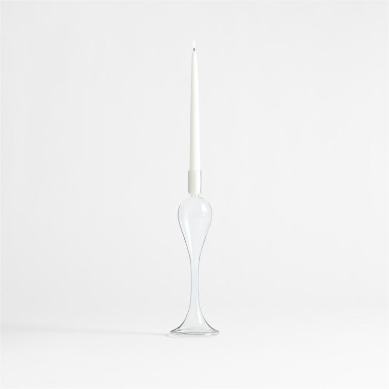 Milano reimagines classic candlesticks in clear glass, streamlining the ornate curves to stunning effect. Hand-blown by skilled craftspeople, this tall candle holder culminates in an elongated cup that supports a taper or double as a bud vase. Display the sophisticated piece solo for a sculptural look, or layer with other exclusive Milano glass taper holders in various heights for a more extravagant effect. Due to artisanal crafting, each small candlestick is beautifully unique.