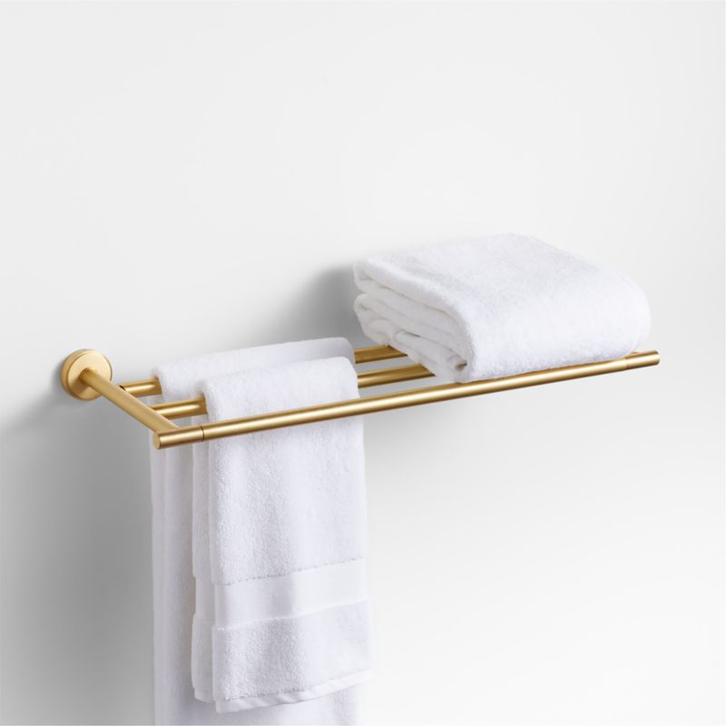 Sometimes it's the small things that pull a room together. That's why we've designed a hardware collection with modern silhouettes and a touch of tradition to give your bathroom that perfect finishing touch. Grooved detailing and a brushed finish lend an industrial vibe to this brass wall-mounted towel rack. Anchored by scaled-up circles, the triple-rod towel bar provides plenty of space to hang and stack towels of various sizes. Provided hardware makes it easy to refresh the look of bathrooms and powder rooms.