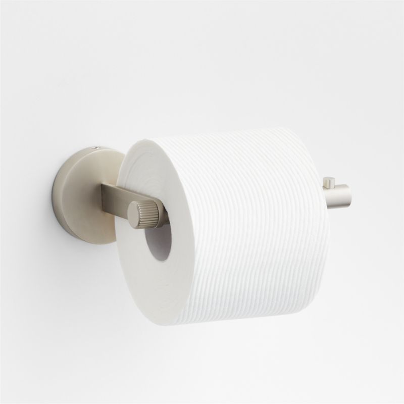 Sometimes it's the small things that pull a room together. That's why we've designed a hardware collection with modern silhouettes, clean lines and a touch of tradition to give your bathroom that perfect finishing touch. Made of brass and finished in brushed nickel, this toilet paper holder lends industrial chic to its minimalist design. Extending from a flat bar anchored to a circular mount, the round bar is capped with a fluted end for a bit of texture. Open ended to facilitate paper roll changes, the wall-mounted holder installs easily with included hardware.