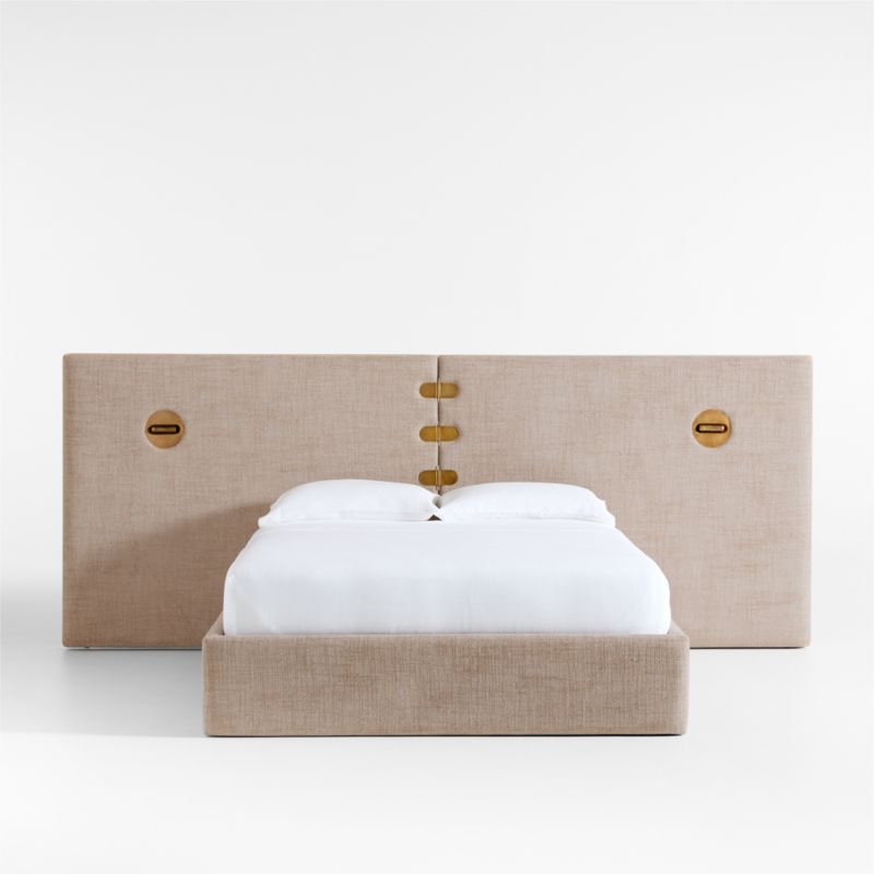 Lushly appointed with a commanding presence, Montecito is a bedroom retreat you won't want to leave. Fully upholstered in warm light brown, the bed extends its oak-trimmed headboard beyond the frame to backdrop nightstands (we recommend Brigette's Venice bedside tables). Brass detailing accents the headboard seam and the circular-plated nightlights. Making it super easy to light up nighttime reading without getting out of bed, the tubular lights turn on when pulled out and turn off when pressed back into place. Plus they swivel 180° to provide pinpoint illumination. Luxe and commanding, this is a bed you won't want to leave.