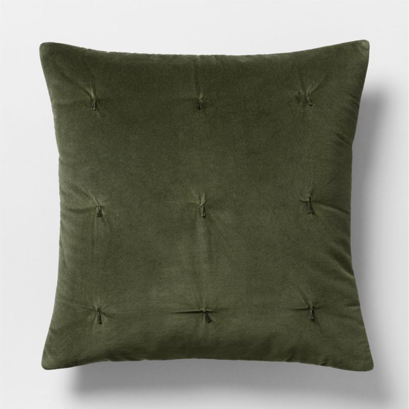 A beautiful blend of linen and organic cotton weaves our uniquely textured velvet bedding. Slubbed for a matte, understated glamour that's oh-so-modern, the quilted pillow sham dresses up the bed with coziness and color. Tufting finishes the dark grey-green sham with a grid of petite tassels in the same deep hue. Layer with our other ficus green bedding for a serene monochromatic look or with our white sheets to add crisp contrast.
