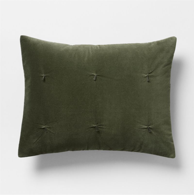 A beautiful blend of linen and organic cotton weaves our uniquely textured velvet bedding. Slubbed for a matte, understated glamour that's oh-so-modern, the quilted pillow sham dresses up the bed with coziness and color. Tufting finishes the dark grey-green sham with a grid of petite tassels in the same deep hue. Layer with our other ficus green bedding for a serene monochromatic look or with our white sheets to add crisp contrast.