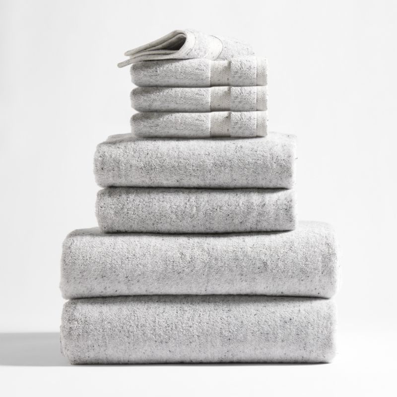 This set combines a full-suite—four washcloths, two hand towels and two bath towels—of luxurious Turkish organic cotton towels in grey with flecked detail for a sumptuously outfitted spa-like bathroom. Extremely plush, dense and incredibly soft, the towels are made of double-ply organic cotton threads to ensure strength and durability. Each one is woven with looped construction to dry quickly and with an intricate herringbone dobby weave along the border for a bit of elegant detail. Washing will only make these exceptional textiles more absorbent and soft.
