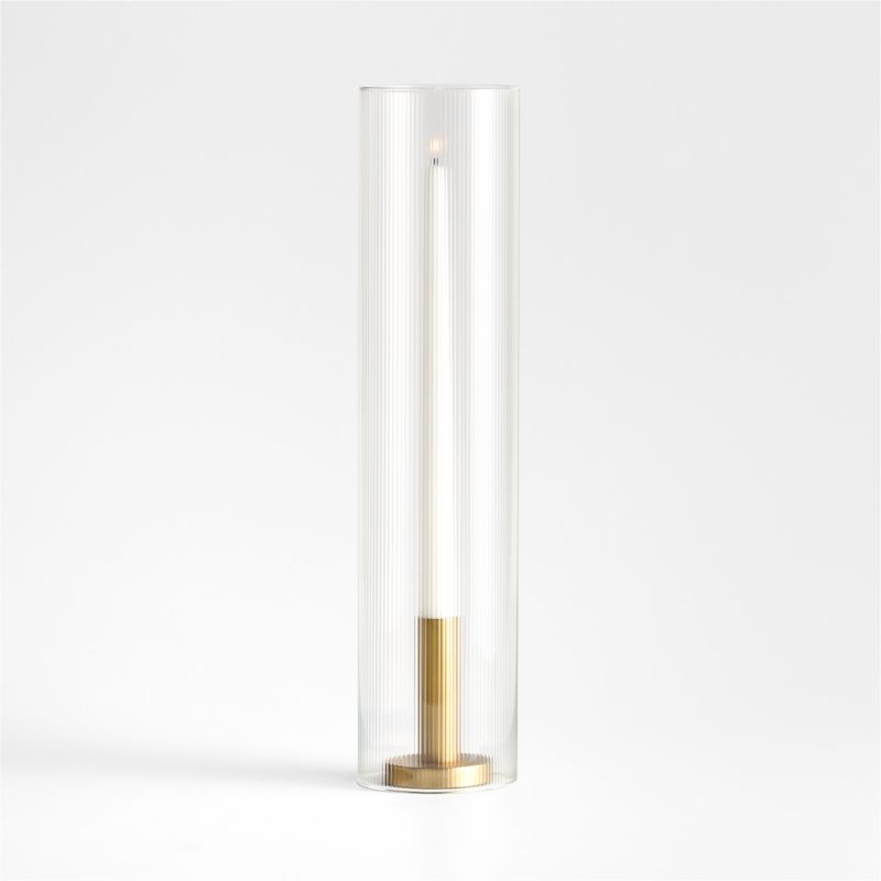 Sleek and streamlined, our Orion candle holder anchors tapers in columns of brass-finished aluminum. A slim cylinder of handblown glass slips over the candle holder to protect a lit flame and is detailed with narrow fluting to enhances the flickering effect. This striking pair adds contemporary style to candlelit moments.