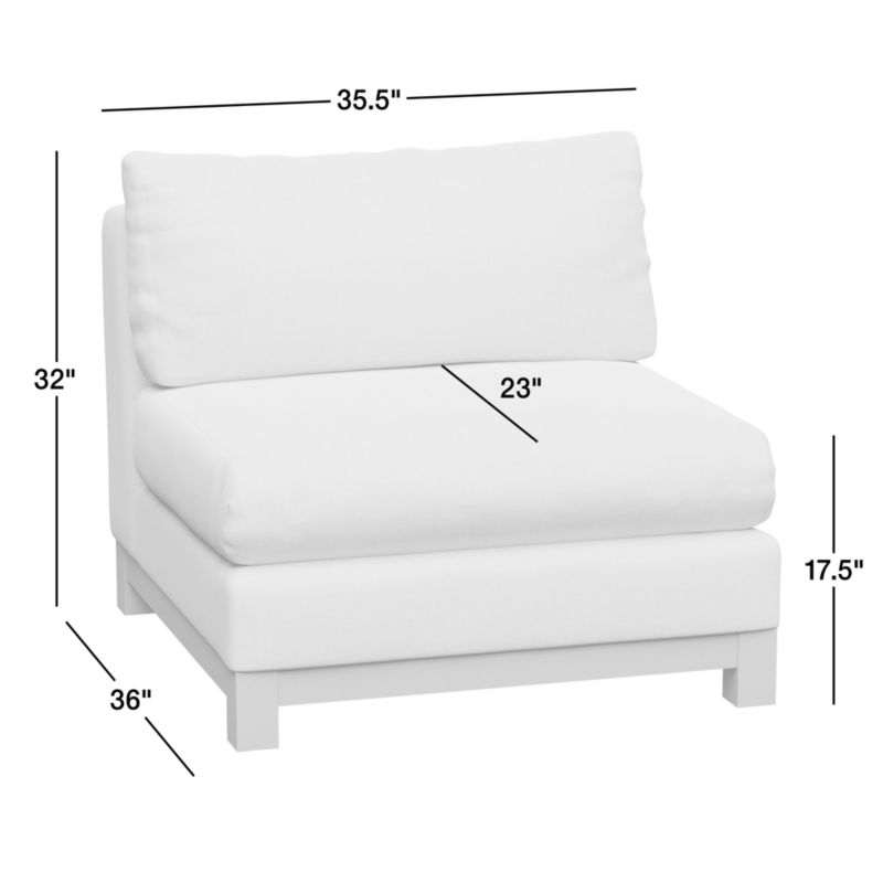 Long, low and made for lounging, our Pacific sectional collection complements contemporary living rooms with its easy, breezy style. Sustainably sourced wood with a light finish anchors the armless chair with square legs and a full rail. Along with a pillowy back cushion, the bull-nosed seat ensures a comfortable stay with a medium-density, not-too-deep cushion. Combine with other pieces to configure a sectional sofa that's just right for your space. You'll love it upholstered in Olef, a 100% recycled fabric with subtle textured slub and marled yarns.