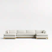 Long, low and made for lounging, our Pacific sectional complements contemporary living rooms with its easy, breezy style. Sustainably sourced wood with a light finish anchors the combination of a left-arm chaise and right-arm sofa with square legs and a full rail. Along with pillowy back cushions and supportive bolsters, the bull-nosed seat ensures a comfortable stay with medium-density, not-too-deep cushions. You'll love the sectional sofa upholstered in Olef, a 100% recycled fabric with subtle textured slub and marled yarns.