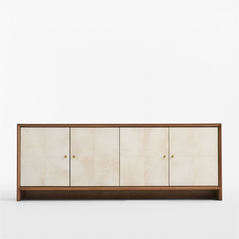 A collector's item in the making, Parchemin is an ode to heirloom materials and the glamour of 1940s design. Flat door fronts on the clean-lined credenza are perfect for showcasing gridded natural parchment, uniquely textured and varying in tone to make each piece truly one-of-a-kind. Dotted with sculpted brass knobs, the doors are set in a slim, beveled walnut frame finished in glossy smooth lacquer. This sleek, sophisticated credenza offers generous storage with one adjustable shelf per cabinet.