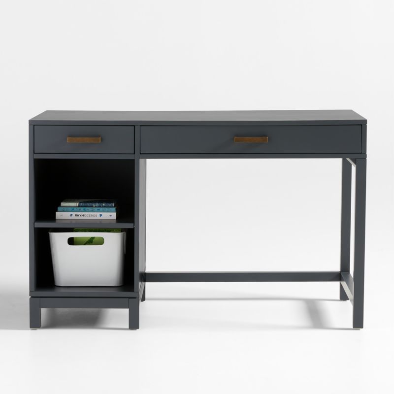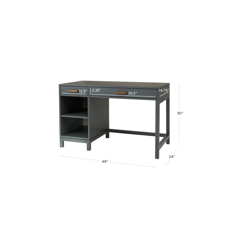When it comes to furniture that's ready for the long haul, you can be sure our Kids Parke Desk was made to last. That's because this study space essential features clean, simple lines, giving it a timeless look that can coordinate with nearly any style. It features two roomy drawers, including one with removable dividers for organization. Sturdy construction means it'll carry its weight for years to come, while drawer pulls with an antique brass finish provide a sophisticated accent.