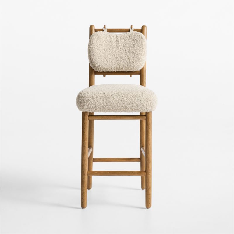 Pierre cozies up to kitchen counters or high dining tables with faux shearling seats and vintage-inspired woodworking. Made of solid oak, the carefully designed counter stool showcases subtly tapered legs, bullnose feet and through-dowel detailing on the back crossbars. Faux shearling in a neutral linen shade layers on extra softness to the well-padded seat and the removable cushion that attaches to the back with fabric straps.