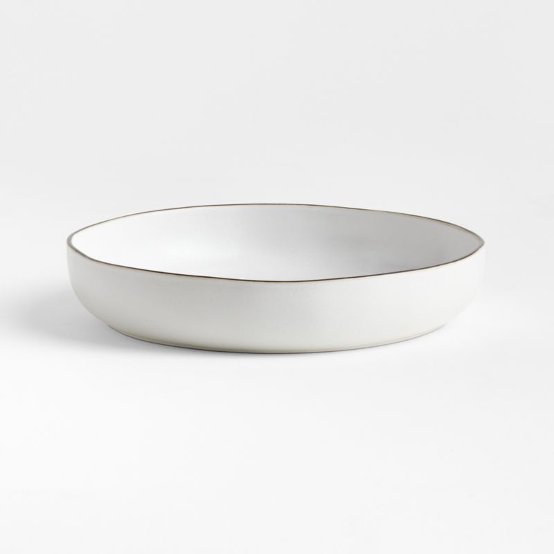 Rimmed in black, our white-glazed Range bowl showcases its perfectly imperfect artisanal edges. Hand-finished and -painted by talented craftspeople, the low bowl mimics the perfectly imperfect edges of the hand-thrown ceramic original for an organic look. Pair the bowl with the other pieces in our exclusive Range dinnerware and serveware collection to set an elevated dining table.