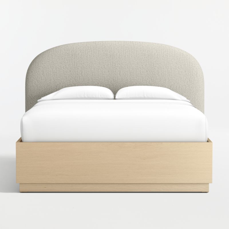Our custom bed collection lets you mix and match our top-selling headboards and bases for a look that's truly yours. Our Rayna arcs a headboard that's soft in look and feel. Shaped with rounded edges and clean seams, the fully upholstered headboard strikes the perfect balance between cozy and streamlined. The Batten base complements with a sleek plinth design and the lively grain of oak veneer enhanced with a white oak finish. A great choice for storage-challenged bedrooms, the base seamlessly integrates a drawer at the foot of the bed for placing bedding, blankets and off-season garments.
