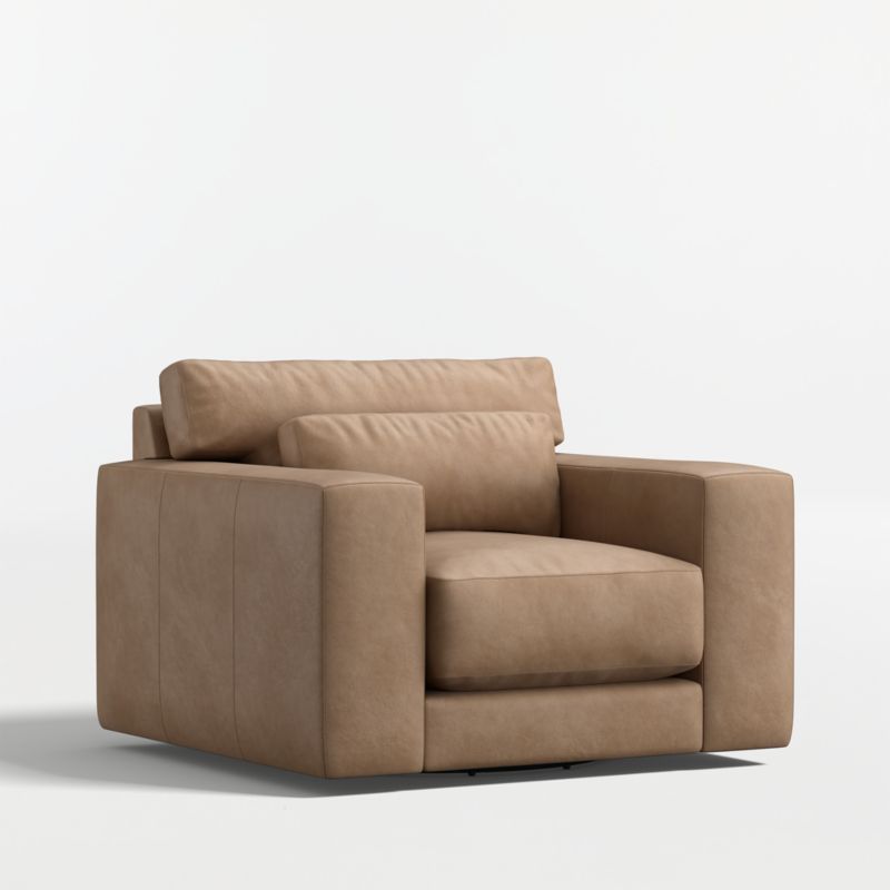 Years in the making, we pulled in customer-favorite design elements to create Retreat, a plush new hangout spot with a clean, modern look. The swivel chair has a soft-yet-supportive seat cushion and lumbar pillow that removes for a deeper, more loungey sit. Extra-wide arms provide a spot to park a book, tablet or bowl of popcorn, and the T-shaped back cushions snuggles in nicely to keep the look clean and current. The leather upholstery proudly displays natural markings for a rustic vibe. Only a coat of wax is applied to unify the color and lend a smooth finish to a handsome leather that will continue to charm as it develops a rich patina over time.