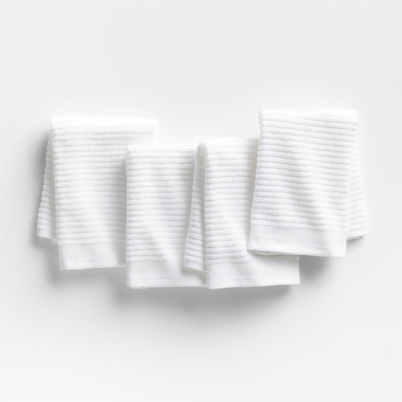 Stock your home bar with this handy set of white dishcloths. Made of organic cotton with a ribbed weave, the soft terry-like cloths are perfect for cleaning glassware. Our exclusive set is a welcome addition to a gift box full of bar tools for the home mixologist.