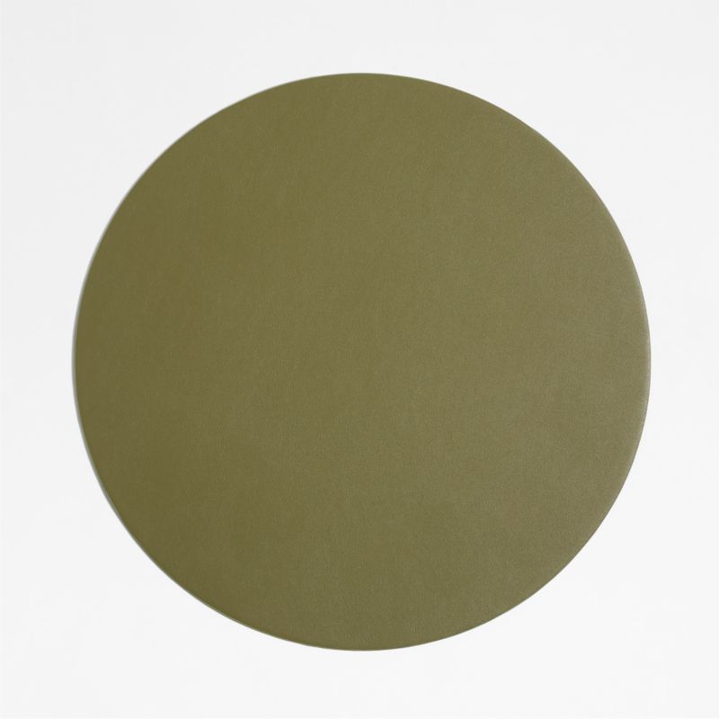 Perfectly round and perfectly faux, our placemat replicates the luxe look of leather. Tinted desert green and flipping to a neutral hue, the double-sided placemat sets a sophisticated and table-saving foundation for any place setting. Made of responsibly sourced materials, the Rizzo faux leather placemat is a Crate & Barrel exclusive.