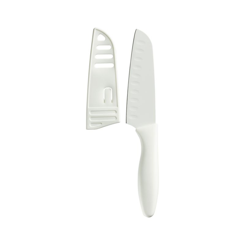 This sheathed, santoku-style knife has a nonstick, high-carbon steel blade for all-purpose paring, peeling and slicing. The covered blade keeps it safe in the drawer or picnic basket. Safety guard adds protection for kids.
