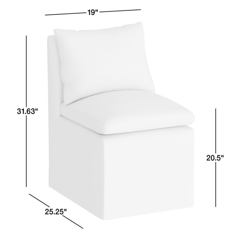 Our fully upholstered outdoor dining chair plays host to extra-plush, pillowy-soft seat and back cushions. Removable and machine washable, the crisp white slipcovers in a linen-textured fabric enhance the chair's casual attitude and beachy flair. The chair comes with two feet options—stationary for a classic look or casters for easy maneuvering.
