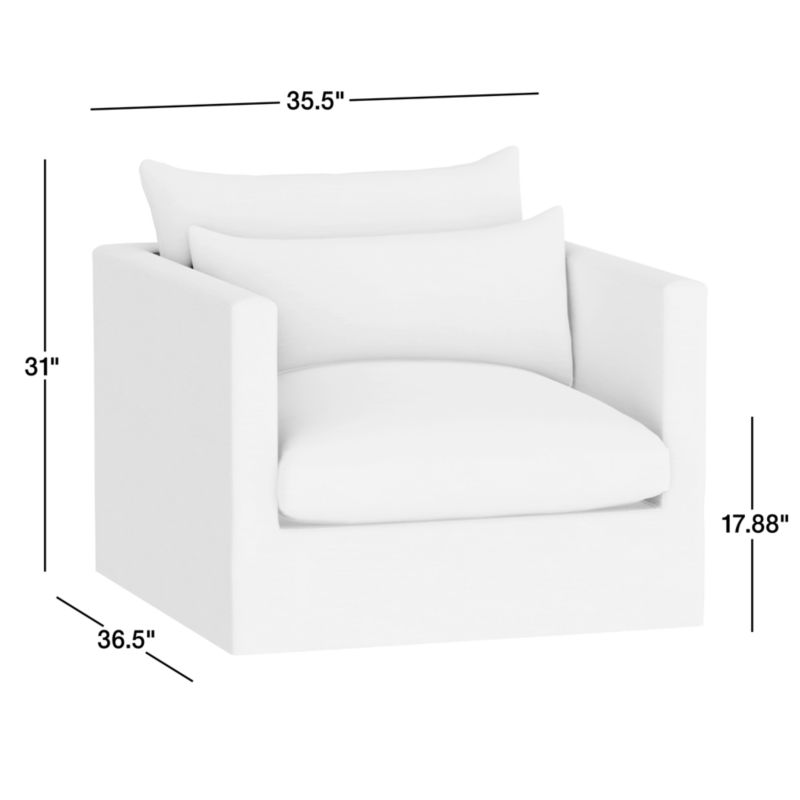 So easy and breezy, you may never want to leave the cozy confines of our outdoor Seascape collection. Slung low on a square base with slim track arms, the lounge chair plays host to extra-plush, pillowy-soft seat and back cushions as well as a scrunchable throw pillow. And the hidden swivel makes it easy to follow a conversation or keep up with the sun. Crisp white slipcovers in a linen-textured fabric enhance the chair's casual attitude and beachy flair.