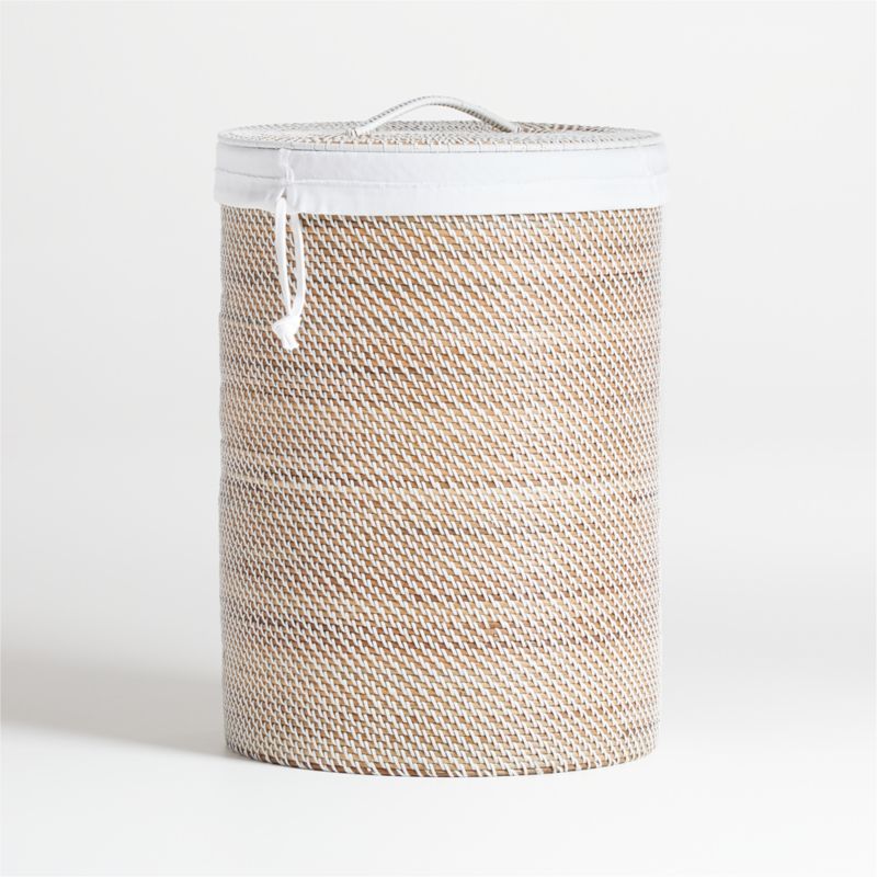 Handwoven rattan, finished in white lacquer, crafts a tall, roomy cylinder, lidded to keep laundry or used towels out of view. The hamper includes a washable cotton canvas liner with a drawstring closure and carrying strap. Each handmade piece will vary slightly in size. Complete the look with our other Sedona white bath accessories.