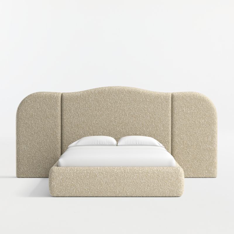 Our Seraph bed makes a modern statement while keeping the look warm and cozy. Sculpted with gently waving contours, the headboard extends wings beyond the frame for a sheltering feel. The rounded rails and footboard continue the cushioned contours, upholstered in a wonderfully soft, textured boucle.