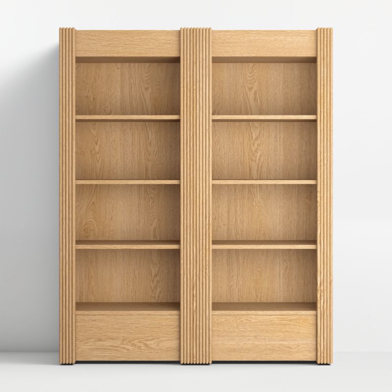 Grand in stature but light in footprint, this set of two Siena bookcases has the look of a custom built-in. Made of oak, the stately pair is given a natural finish to bring out the wood's beautiful grain. Ribbed columns frame the bookcases in texture as they exaggerate the vertical reach. Each bookcase has three adjustable shelves that provide open display of books and collectibles and a single, push-open drawer at the base that offers closed storage.