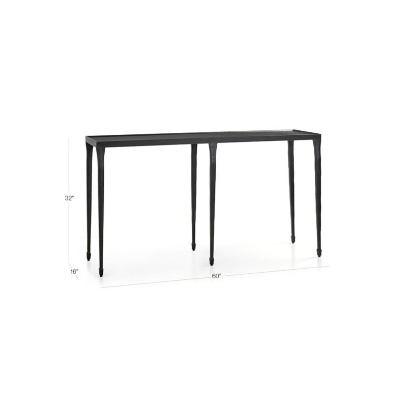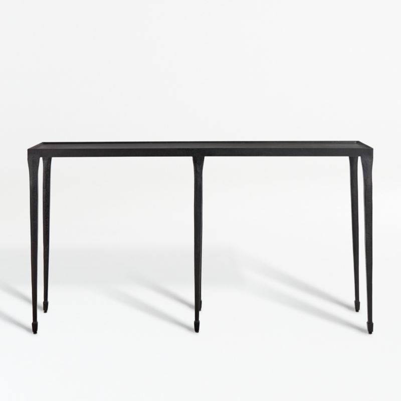 Six attenuated tapered legs of cast iron support the metal top, expertly finished with a multi-step process. The Silviano 60" Console Table is a Crate and Barrel exclusive.