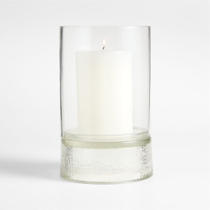 Our Solstice candle holder showcases serious artisanship. Skilled craftspeople blow clear glass into a cylinder before polishing it by hand and elevating it upon a hand-molded, richly textured base. We love the way the hollow base gives the illusion of thick, solid glass. The large hurricane elevates pillars to create a tiered candlelight display, especially paired with its smaller counterpart.