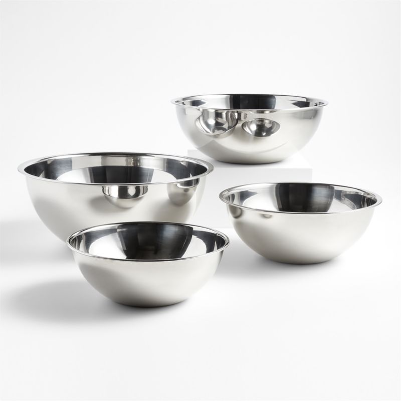 The pros know bowls. This set boasts all of the qualities professional cooks treasure: high-quality stainless steel construction, a wide-open design for easy mixing, pronounced rims for a sturdy grip and dishwasher-safe durability. The bowls also bring a classic, industrial beauty to your home kitchen. A Crate & Barrel exclusive, our set of four restaurant bowls nests for compact storage and looks fantastic on open shelving.
