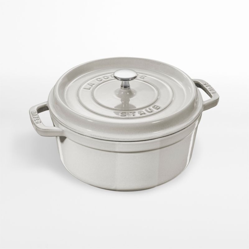 Cook, bake and serve a feast in this Dutch oven that goes effortlessly from stove to oven to table. Made of cast iron finished with a detail-enhancing slip of creamy glaze, the pot cooks evenly and efficiently and its attractive enamel coating resists chipping. Staub's signature matte black interior excels at braising, roasting and caramelizing and is scratch resistant and easy to clean. The round Dutch oven is ideally sized for generous batches of stew or mac and cheese. To ensure moist and flavorful results, the spiked lid is designed to create a rain-forest effect that returns juices back on the food, providing continuous, natural basting.