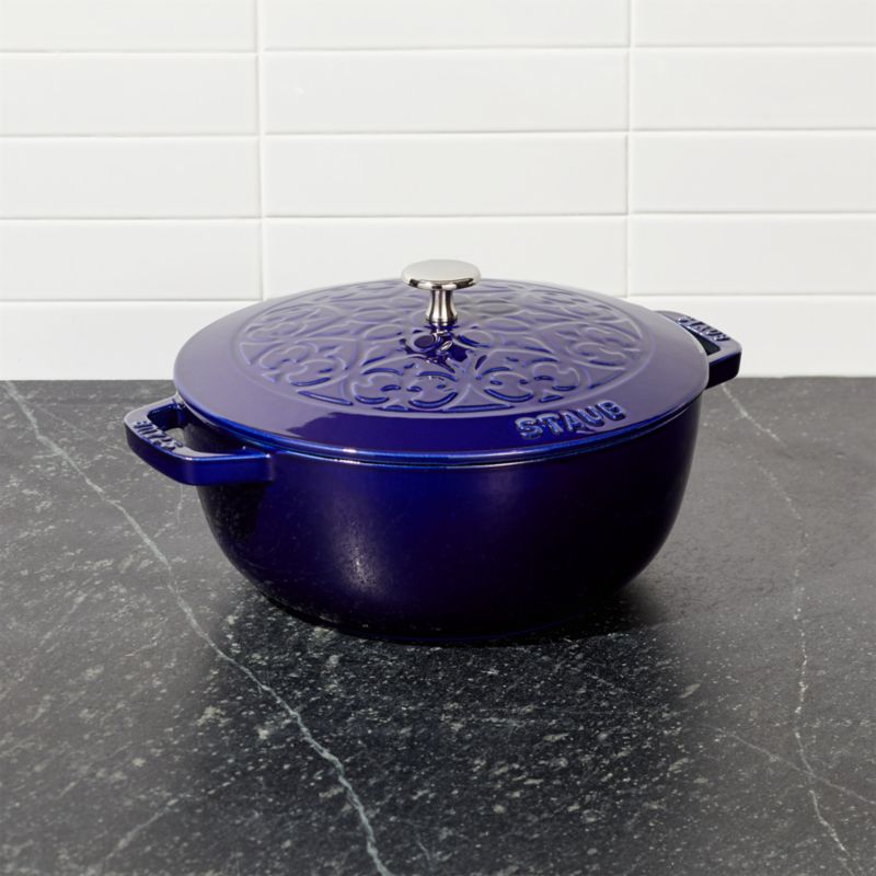 With its stamped lily lid and glossy dark blue enamel finish, this cast iron Dutch oven makes good on its oven-to-table appeal. Preferred by some of the world's greatest chefs, the pot cooks evenly and efficiently. Its signature matte-black enamel interior excels at braising, roasting and caramelizing, and is scratch resistant and easy to clean. The Dutch oven is a timeless standby for stews, roasts, casseroles and other one-pot classics. To ensure moist and flavorful results, the spiked lid is designed to create a rain-forest effect that returns juices back on the food, providing continuous, natural basting.