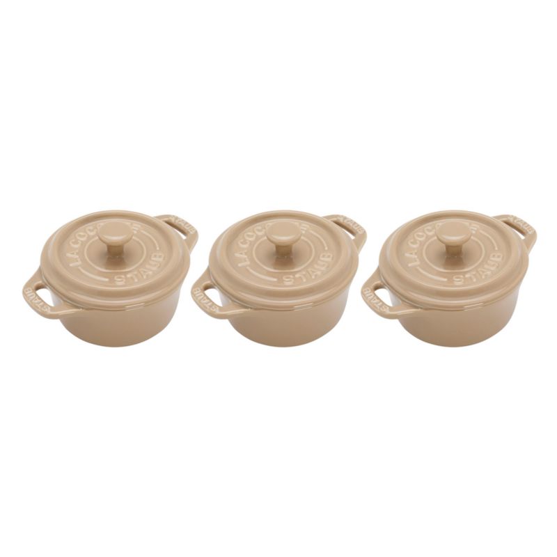 This trio of petite ceramic Dutch ovens puts a pop of color in your kitchen, finished in our exclusive sesame-inspired toasty tan glaze. The glass-porcelain enamel prevents absorption of moisture during baking so contents won't dry out. The three mini cocottes present diners with charming single servings of mac and cheese, pot pie or cheesecake. Resistant to scratches, impact and thermal shock, these lidded baking dishes easily go from freezer to oven to table to dishwasher. Or use the trio to present black pepper, sea salt and red pepper flakes on the dining table or kitchen counter.