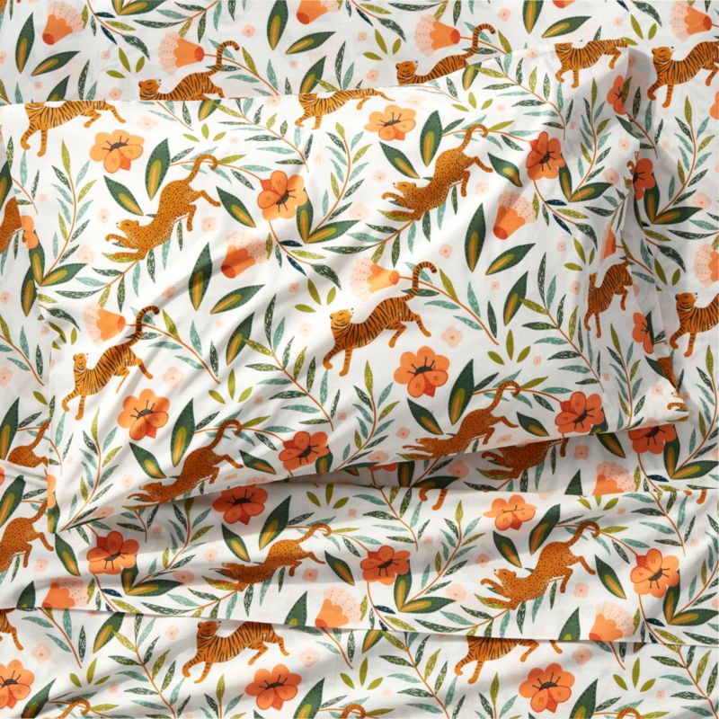 Big cats stalk gracefully amidst oversized plant life, stopping to smell all the prettiest flowers on our Marrakech Tiger Twin Sheet Set. Illustrated in a modern palette of olive green, shades of teal and peachy pinks, the colorful jungle scene pops against the bright white background. Perfect for young adventurers, the organic cotton bed linens clean up easily in the washing machine. This twin set includes one flat sheet, one fitted sheet and one standard pillowcase. To complete the look, add the other bedding in our exclusive Marrakech Tiger collection.