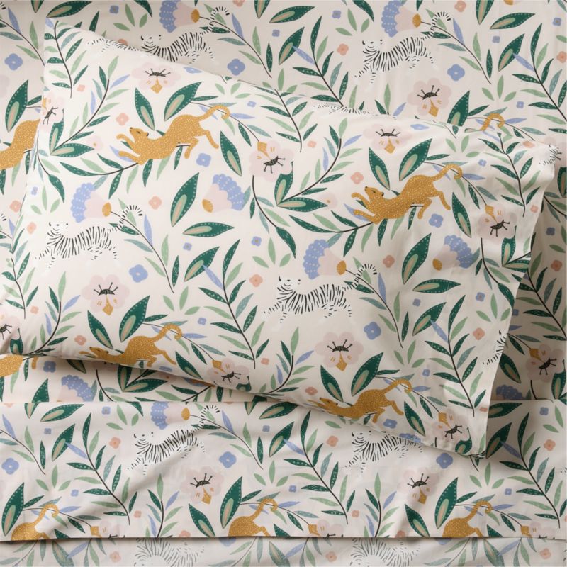 Big cats stalk gracefully amidst oversized plant life, stopping to smell all the prettiest flowers on our Marrakech Tiger Sheet Set. Illustrated in a modern palette of olive green, shades of blue and peachy pink, the colorful jungle scene pops against a neutral background. Perfect for young adventurers, the organic cotton percale bedding cleans up easily in the washing machine. To complete the look, add the other bedding in our exclusive Marrakech Tiger collection.