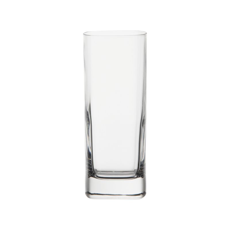 Our modern cooler glass squares the circle, offering a modern update on the classic tall drink glass. Featuring a softy rounded yet geometric silhouette, the glass looks cool and contemporary filled with a Tom Collins, gin and tonic or sparkling water. A thick sham grounds the look, adding nice heft to the hold. This cooler glass is dishwasher-safe for easy cleanup after cocktail hour and dinner parties.