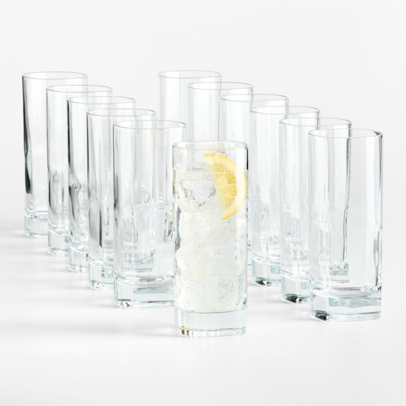 Our modern cooler glasses square the circle, offering a modern update on the classic tall drink glass. Featuring a softy rounded yet geometric silhouette, the glasses look cool and contemporary filled with Palomas, gin and tonics or sparkling water. Thick shams grounds the look, adding nice heft to the hold. This set of one dozen cooler glasses is dishwasher-safe for easy cleanup after cocktail hour and dinner parties.