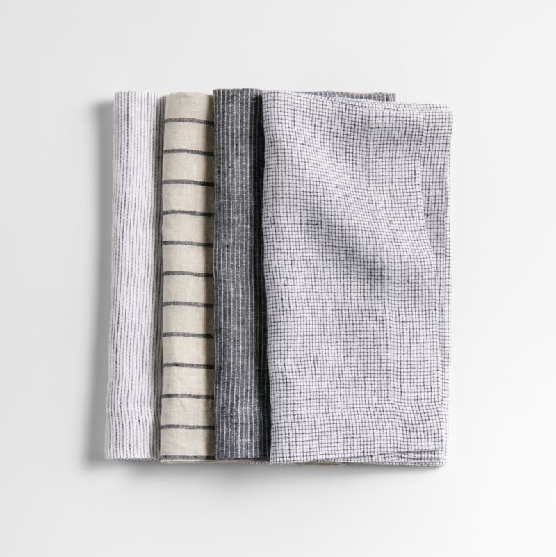 Menswear-inspired cloth napkins in four textural patterns and stripes bring a range of mixed neutrals to the table in crisp, hemmed linen.