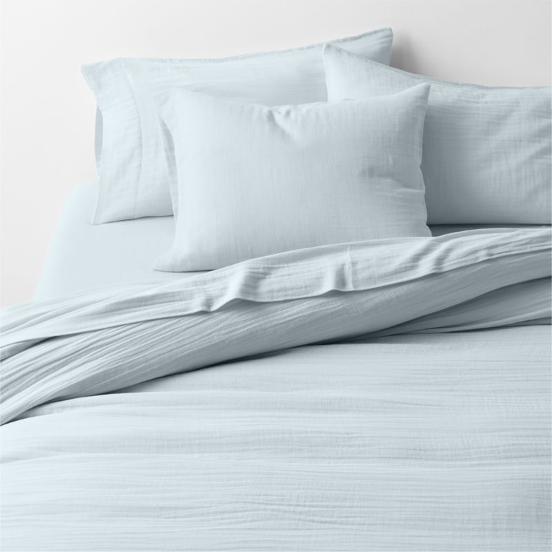 Like sleeping in a cozy cloud. Our gauzy Supersoft bedding is irresistibly soft and airy. The double-layer weaving technique creates pockets of air to create compelling coziness, while the open weave ensures breathability. This organic cotton duvet cover makes the bed with a laid-back, breezy look—especially when layered with other pale blue bedding from our Supersoft collection.