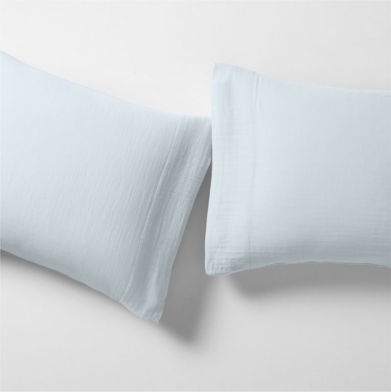 Like sleeping in a cozy cloud. Our gauzy Supersoft bedding is irresistibly soft and airy. The double-layer weaving technique creates pockets of air to create compelling coziness, while the open weave ensures breathability. This organic cotton pillowcase pair makes the bed with a laid-back, breezy look—especially when layered with other pale blue bedding from our Supersoft collection.