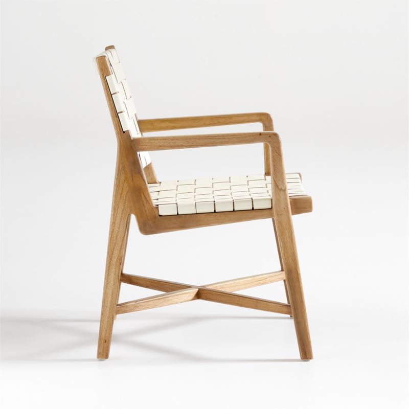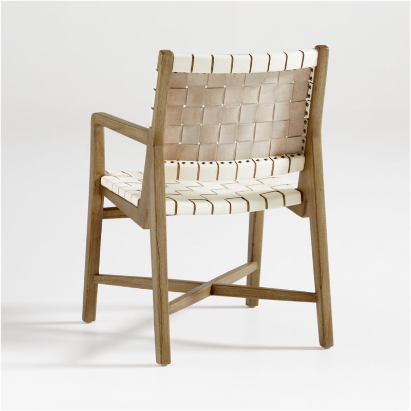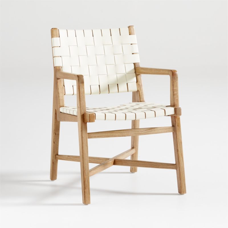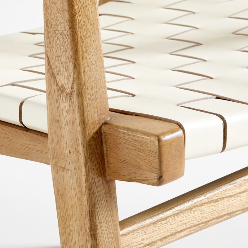 The mid-century woven chair is having a modern moment in Taj. Finished in white, wide straps of full-aniline leather wrap through and around the solid mindi wood frame to create an armchair that's as supportive as it is striking. We love the way the chair calls attention to its craftsmanship, expressed in the visible rivets that fasten the leather to the frame. Designed by Winardi Thamrin, the Taj white leather armchair is a Crate & Barrel exclusive.