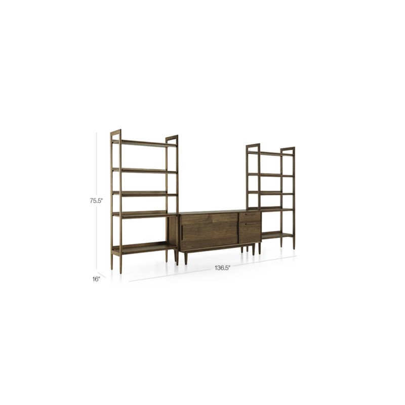 Showcasing the beautiful grain of walnut veneer, this configuration epitomizes the clean, architectural lines of modern design. Slim, conical legs, flat-front doors and linear undercut pulls contribute to Tate's beautiful proportions. Designed by Blake Tovin of Tovin Design, the Tate Walnut 64.5" Media Console with 2 Wide Bookcases is a Crate and Barrel exclusive.
