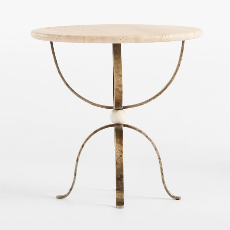 With its Jazz Age elegance and mix of sophisticated materials, it's easy to imagine this set of vintage-inspired tables holding a candlestick telephone or cut-glass brandy snifter. Ribbons of gracefully curved iron form the base, finished in burnished brass to highlight the forged texture. Sleek beige travertine shapes the decorative orb detail as well as the round top sculpted with a simple bullnose edge. Lovely on its own, our Telephone side table looks amazing as a pair, set about the room or flanking a sofa.