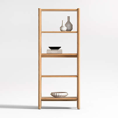 Terrazza transforms bookcase storage with unexpected angles and intersecting shapes. Triangular legs rise straight to the top, lending geo interest and a sense of movement to the bookcases' clean lines. To enhance the beauty of natural oak, the wood is gently wirebrushed and given a light ivory ceruse finish to call out the wood grain. This set of two of our exclusive Terrazza bookcases lets you instantly create a wall of open shelving in your office, library or living room.